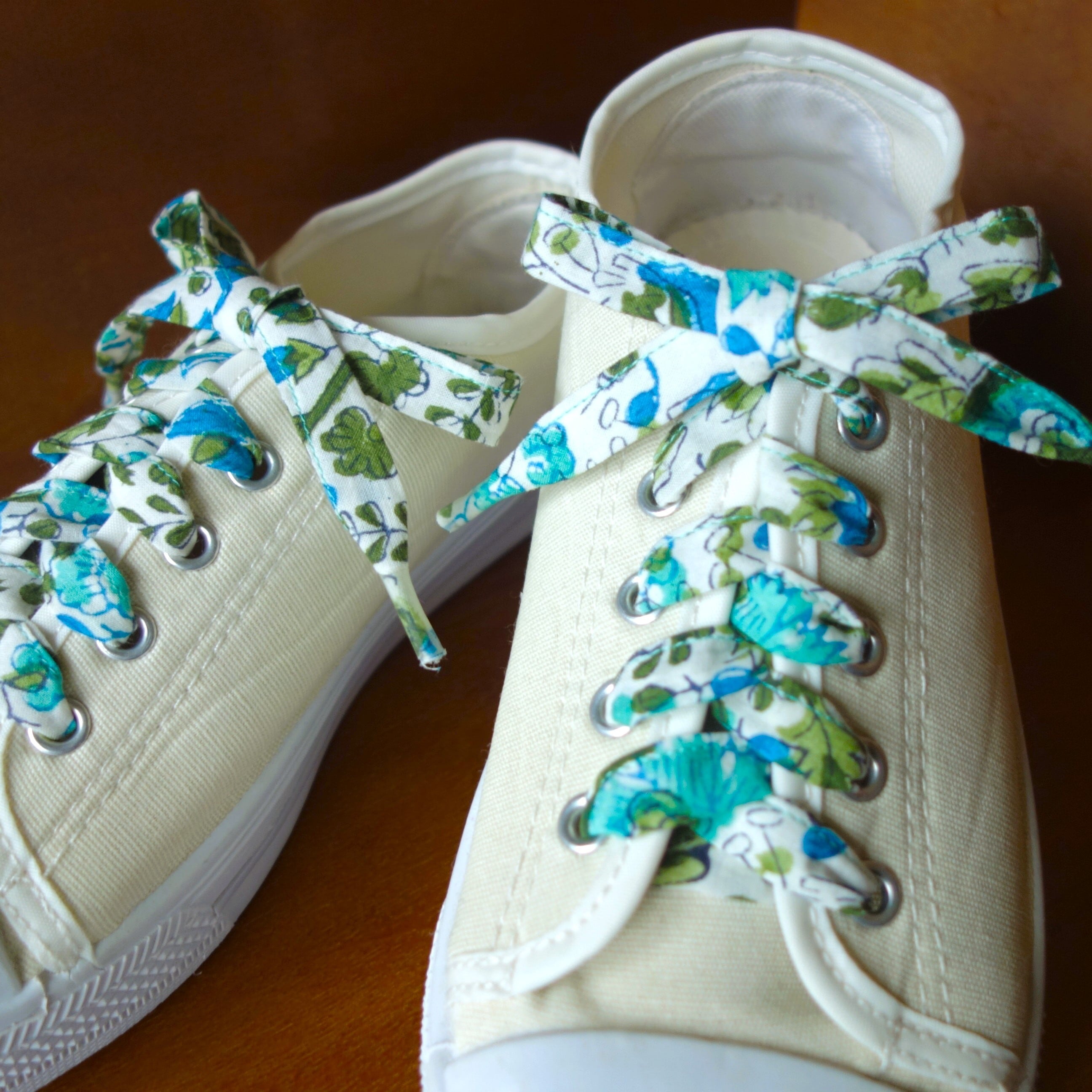 ブロックプリントの布で手作りした靴紐です。